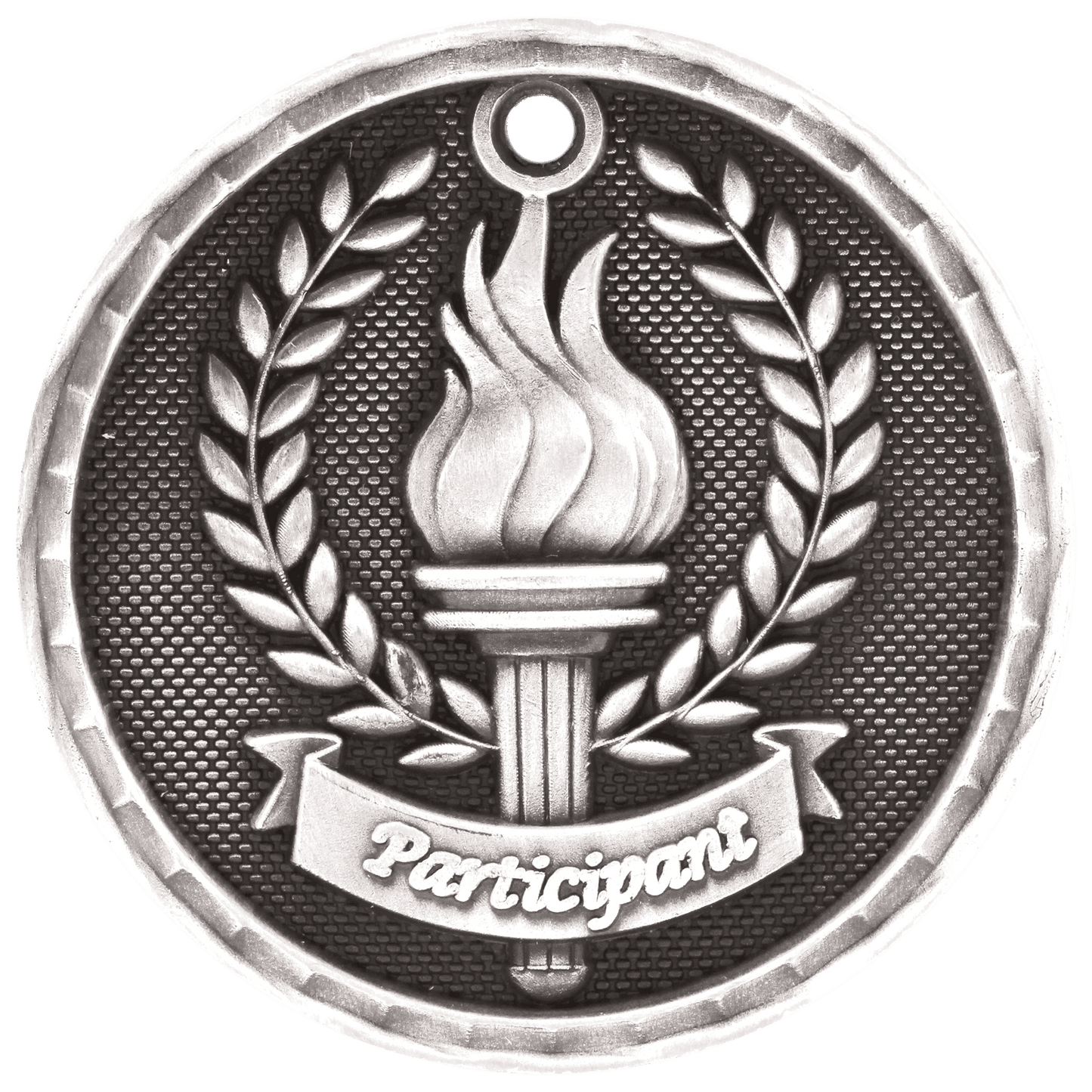 The 3D Participant Medal is a thick 2 inch medallion that has a deep cut 3D relief. This award medal is available in antique gold, silver and bronze finish. These Participant medals look great with your choice of a either a 7/8 inch or 1.5 inch wide neck ribbon. The back of these Participant medallions have a 1.75 inch diameter space for an engraved plate that can hold up to 6 lines of engraving with 12 to 20 characters per line.
