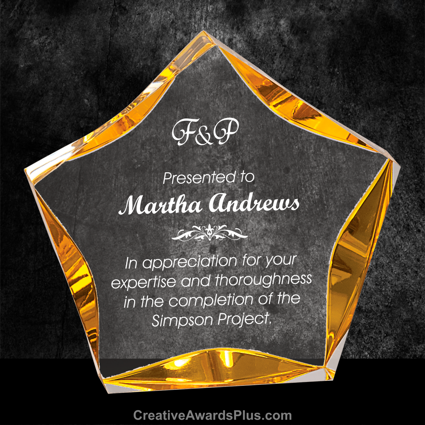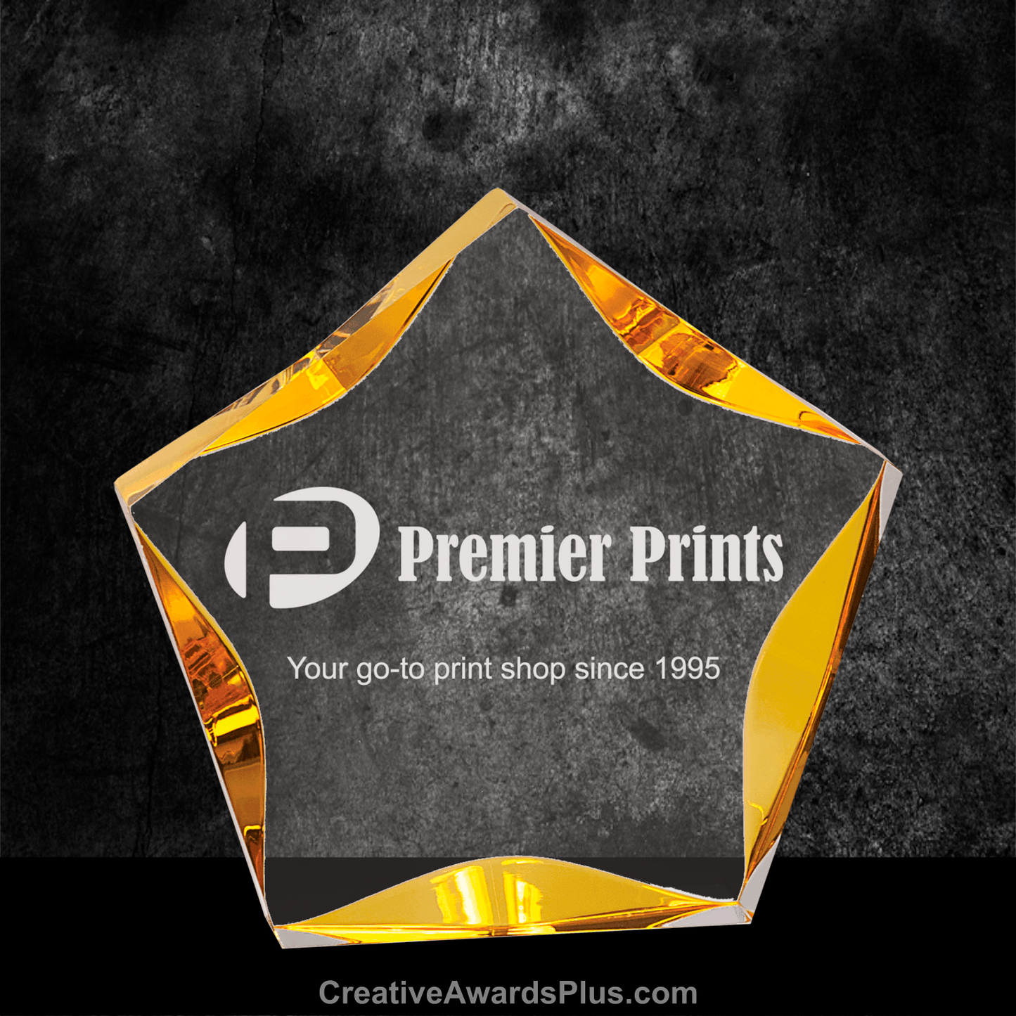 Luminary Star Acrylics are self-standing and 1 inch thick. The stars are clear with a translucent blue or gold accent color. Customization information is laser engraved on the back of the acrylic award creating a frosted white effect.
