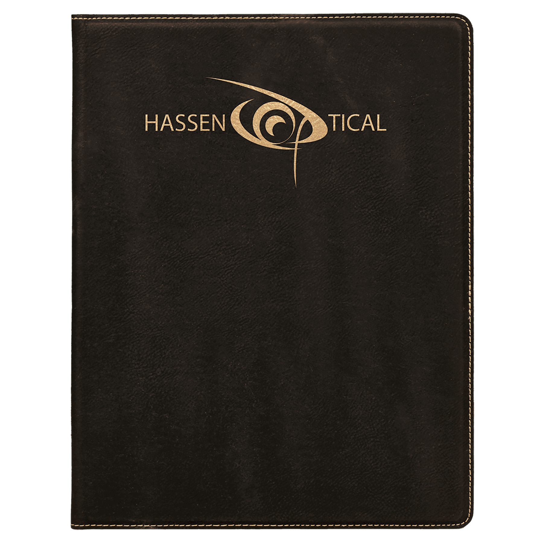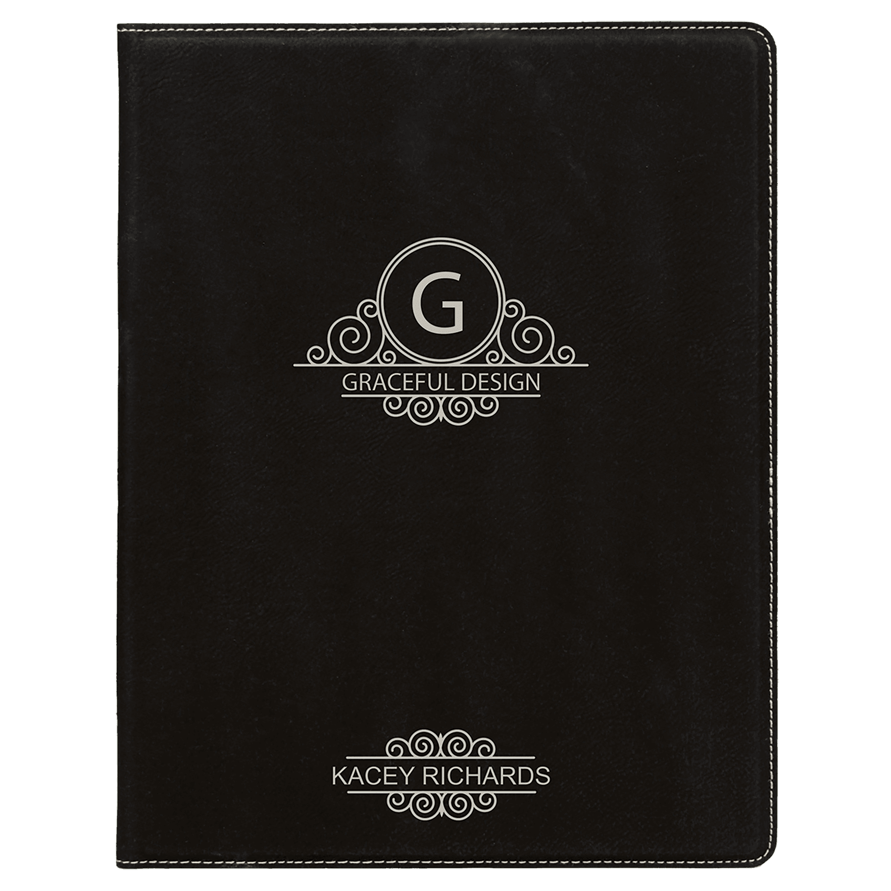 The Leatherette Portfolio offers the look and feel of genuine leather at a fraction of the price. This richly textured, synthetic material is water resistant, easy to clean and durable enough for the rigors of daily use. The high quality workmanship of each leatherette piece is sure to impress every recipient with its elegant individuality. The cover of the portfolio is laser engraved with your logo, monogram, lettering or other artwork. The color of the engraving on most portfolios is black. However, the Black/Gold and Rustic Brown portfolios engrave gold. The Black/Silver and Blue portfolios engrave silver.