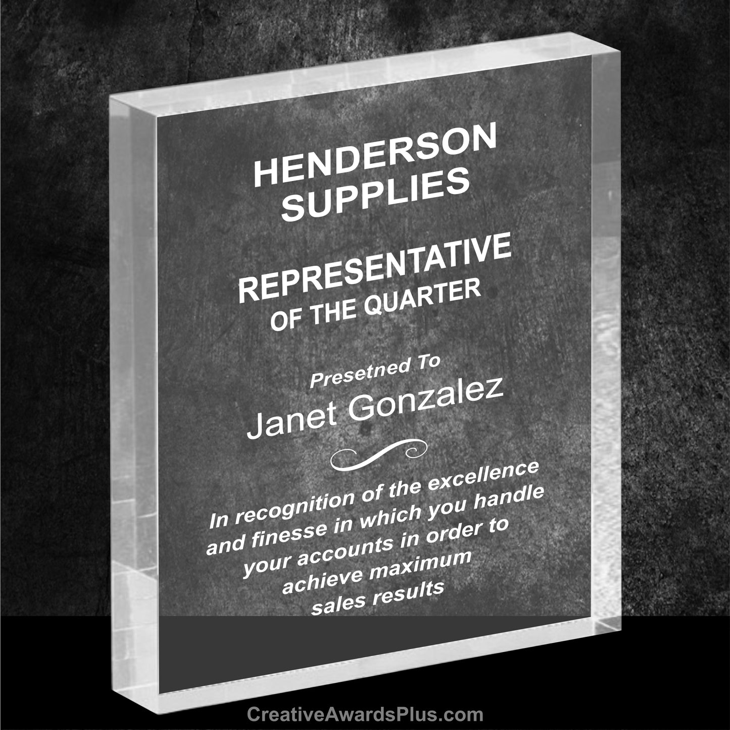 The Rectangle Acrylic Award is self-standing and 1 inch thick. The acrylic award features a simple pallet with no bevels. The acrylic award is laser engraved with your personalization information creating a beautiful frosted white appearance.