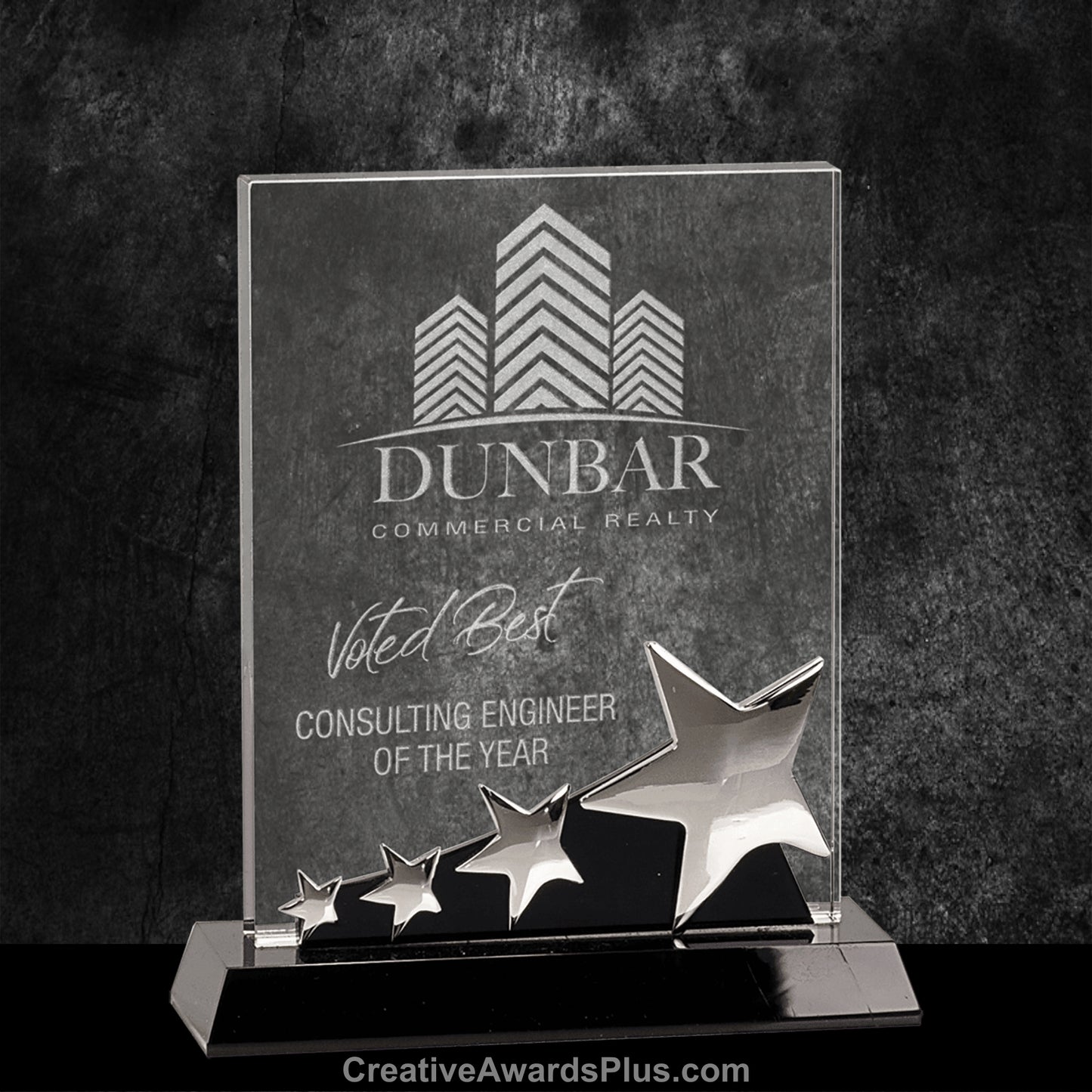 Our Silver Star Crystal Award has a handmade optical crystal rectangle with silver stars attached to black pedestal base. Your personalization will be sand etched creating an elegant frosted appearance. Packaged individually in a lined gift box. Choose Premier Crystal to honor rising stars!